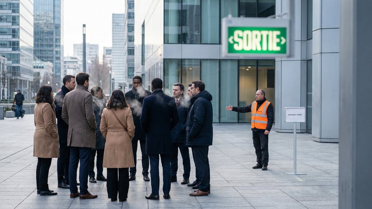 Le fameux "point de rassemblement" dessiné sur un plan en sous‑sol fait toujours sourire. Mais quand il fait 3°C, que le vent traverse le parking, et que les collaborateurs se serrent les épaules, les choix d'implantation prennent tout à coup une autre dimension.